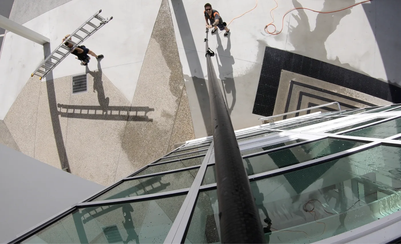 Water-fed pole with soft brush — The standard professional method. Pure water (de-mineralised or reverse osmosis) is delivered through the pole to a soft bristle brush. The pure water leaves no mineral residue, so the panels can air-dry spot-free. This is the most effective DIY approach if you can access the equipment.